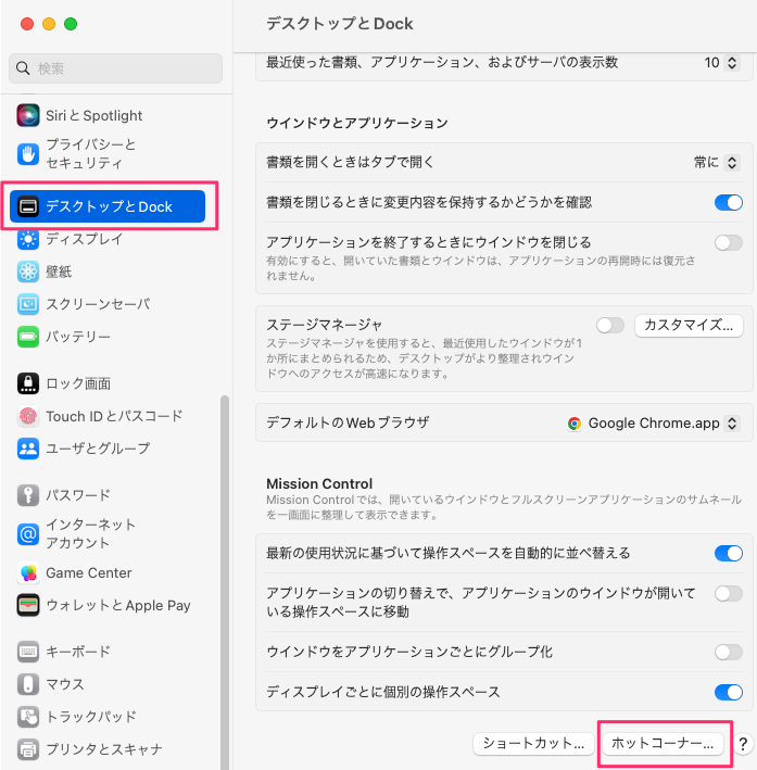 Macのホットコーナーは、画面の四隅に特定のアクションを設定できる機能です。これにより、マウスカーソルを四隅のいずれかに移動させることで、スクリーンセーバーの起動や通知センターの表示、デスクトップの表示など、さまざまなアクションを実行できます。ホットコーナーの設定は、システム環境設定の「Mission Control」または「デスクトップとスクリーンセーバー」から行うことができます。便利な機能ではありますが、誤ってアクションが実行されるのを防ぐために、適切な設定を行うことが大切です。
